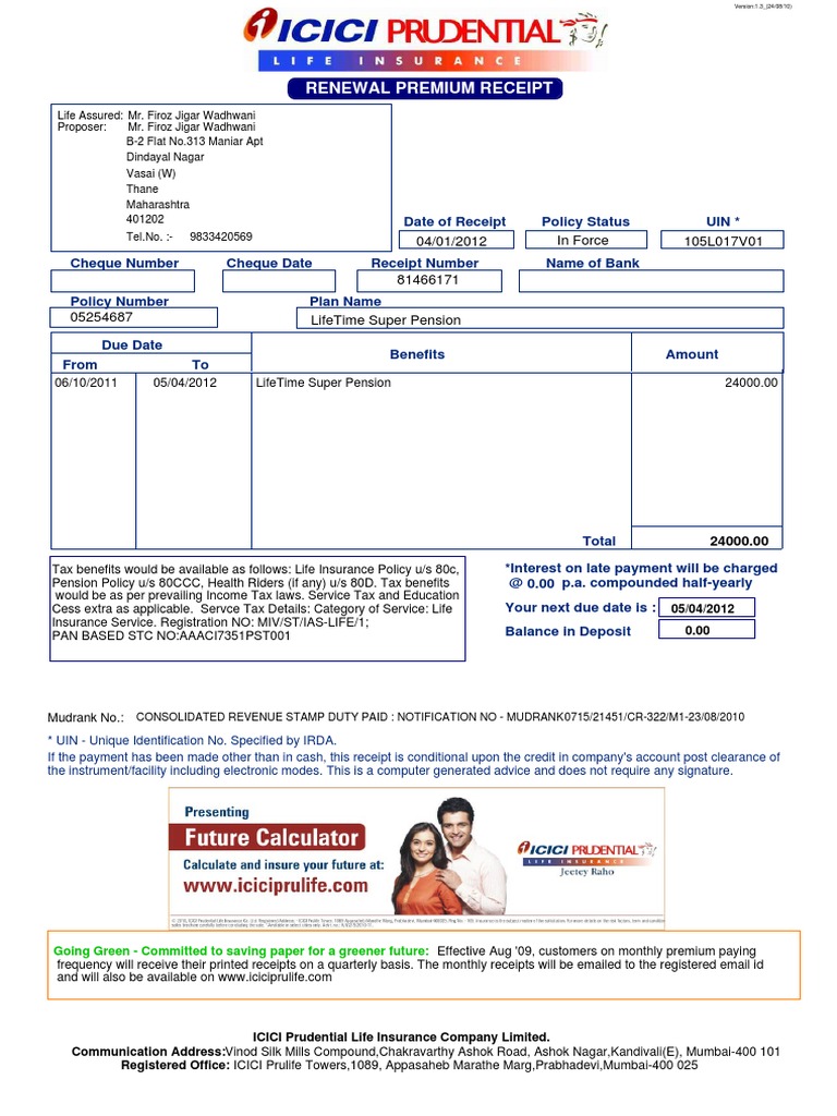 Icici Receipt Life Insurance Receipt