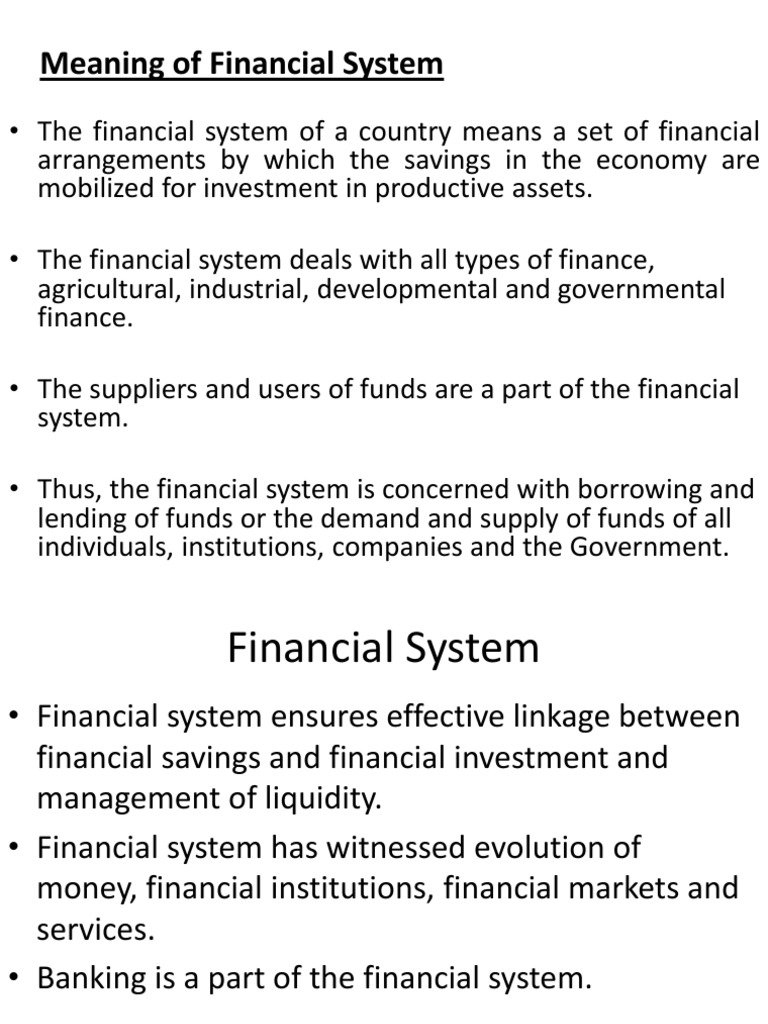 Information and translations of Financial System in the most comprehensive dictionary definitions resource on the web. Meaning- In finance the financial system is the system that allows the transfer of money between savers and investors and borrowers. The system consists of savers intermediaries instruments and the ultimate user of funds.